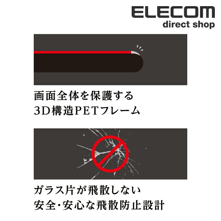 ■ガラスフィルムを衝撃から守るPET素材のフレームが付いており、四つ角が割れない安心設計です。