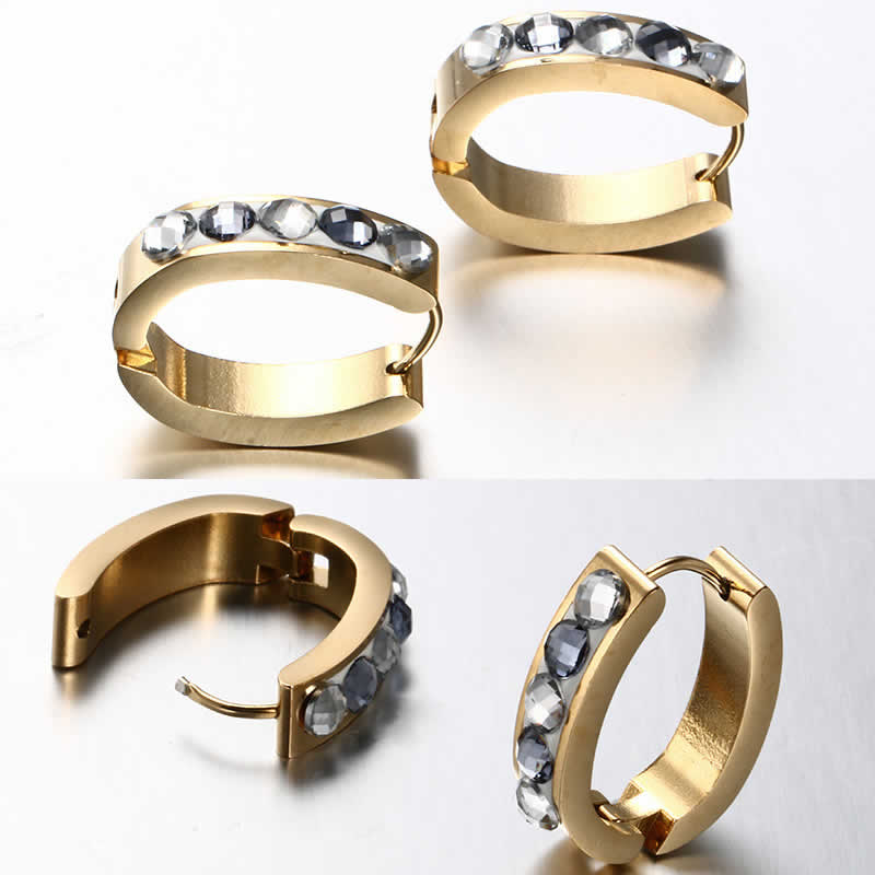 エッグ型のゴールドのフープピアスに大きなジルコニアを並べたステンレスピアス。