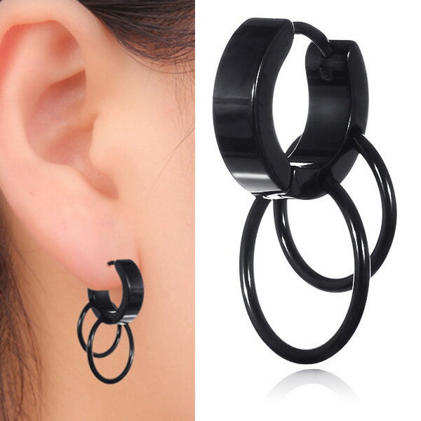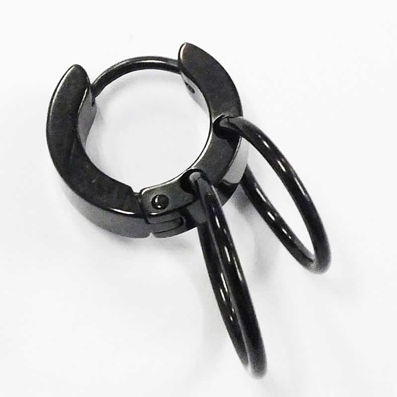 ダブルリングフープピアス(ブラック)/1個販売 黒 18G 18ゲージ サージカルステンレス316L リングピアス フープピアス メンズ レディース ステンレスピアス 低アレルギー 軟骨 耳 人気 リングピアス 中折れ センター折れ おもしろ リング付き 2個 2つ スレイブ スレーブ